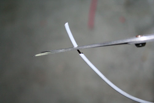 利用剪刀或剝線器,將準備連接燈座的電線外皮剝開。