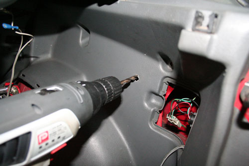 再用裝上9公分鉆頭的電鉆在飾板上鉆出一小孔,作為安裝燈座之用,請先測試燈座是否可順利安裝,若孔徑過小可利用鉆頭進行研磨加大。